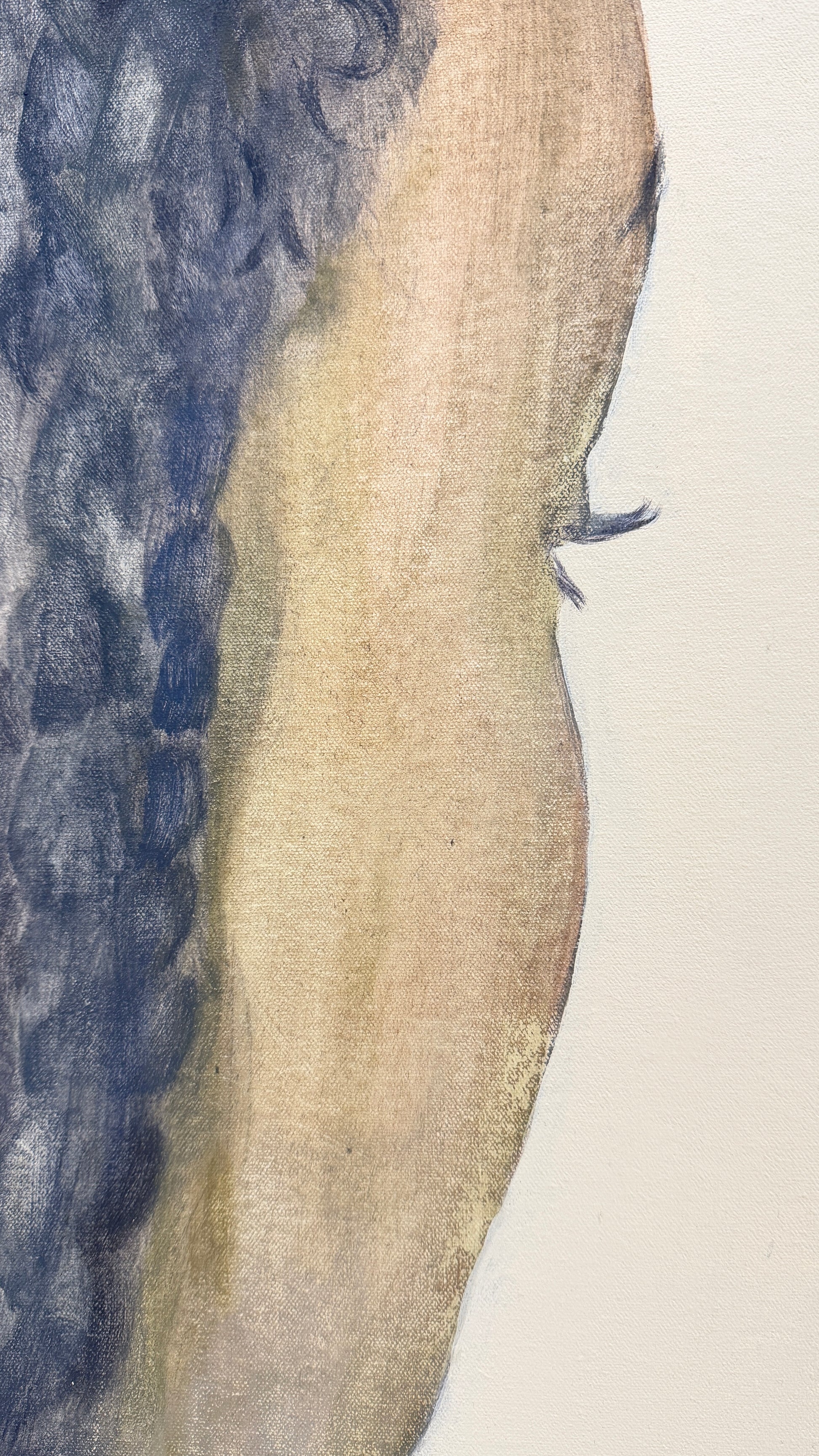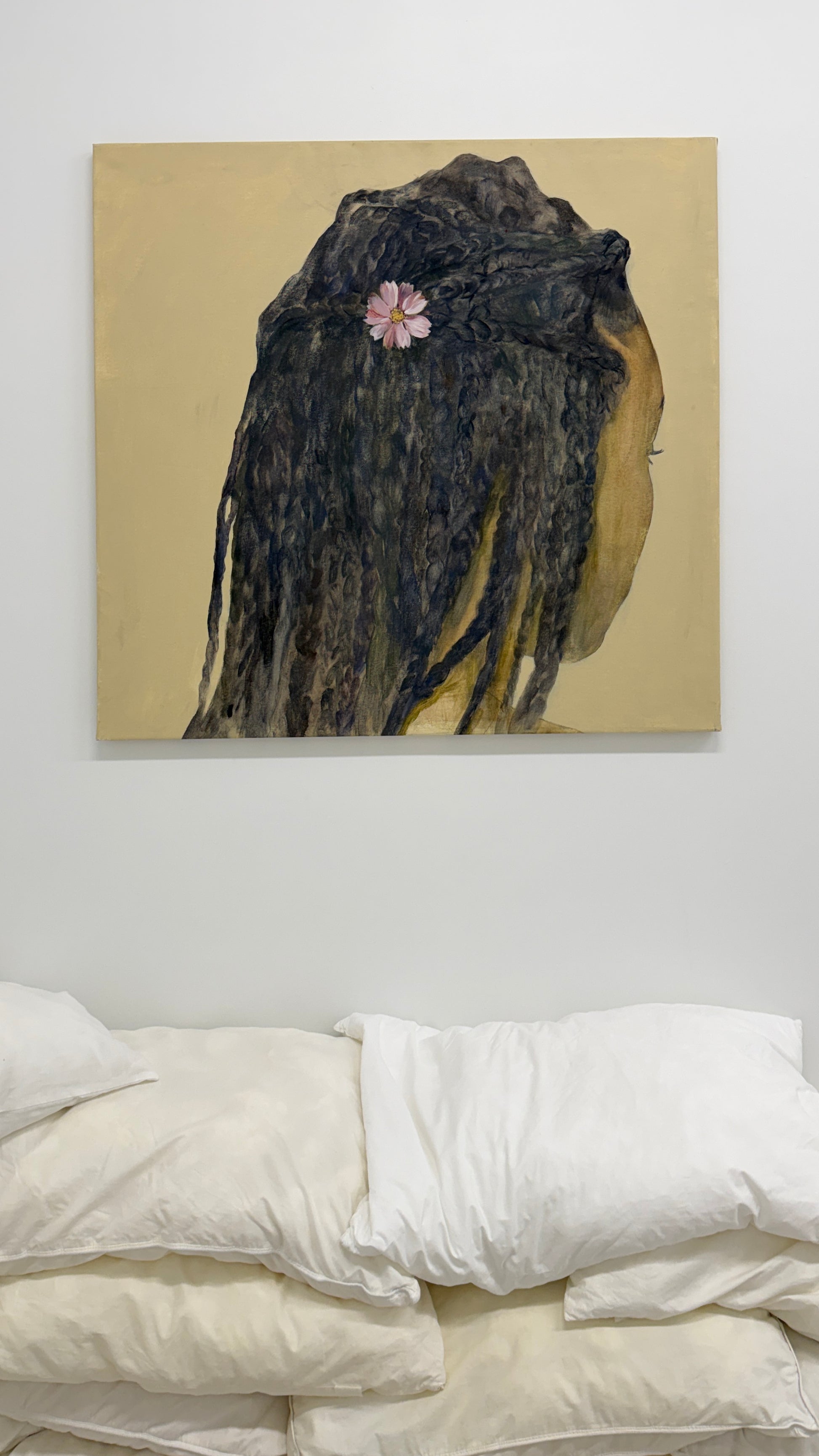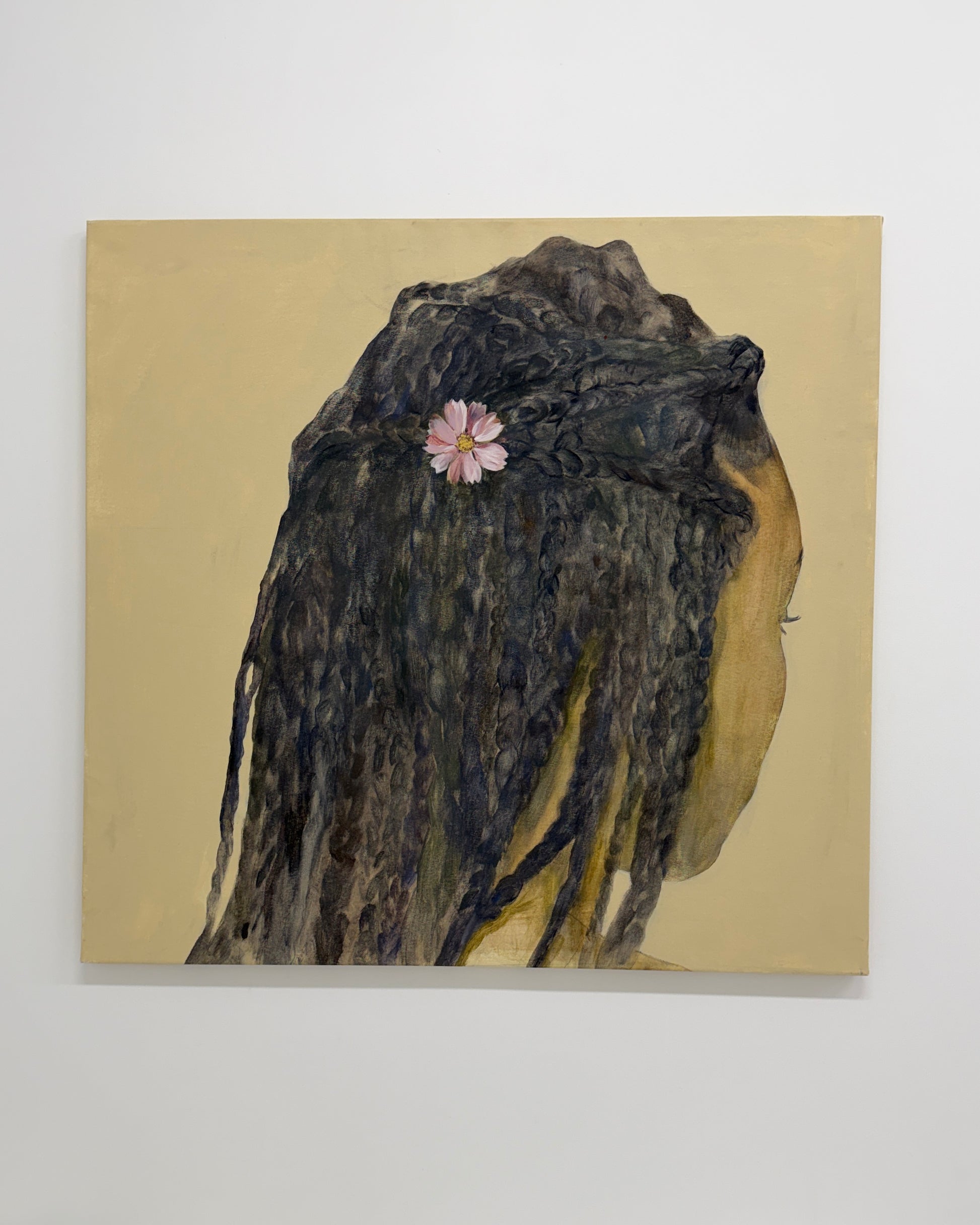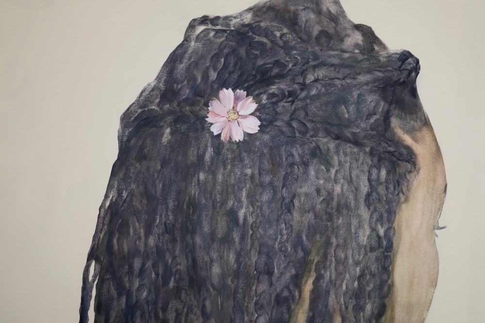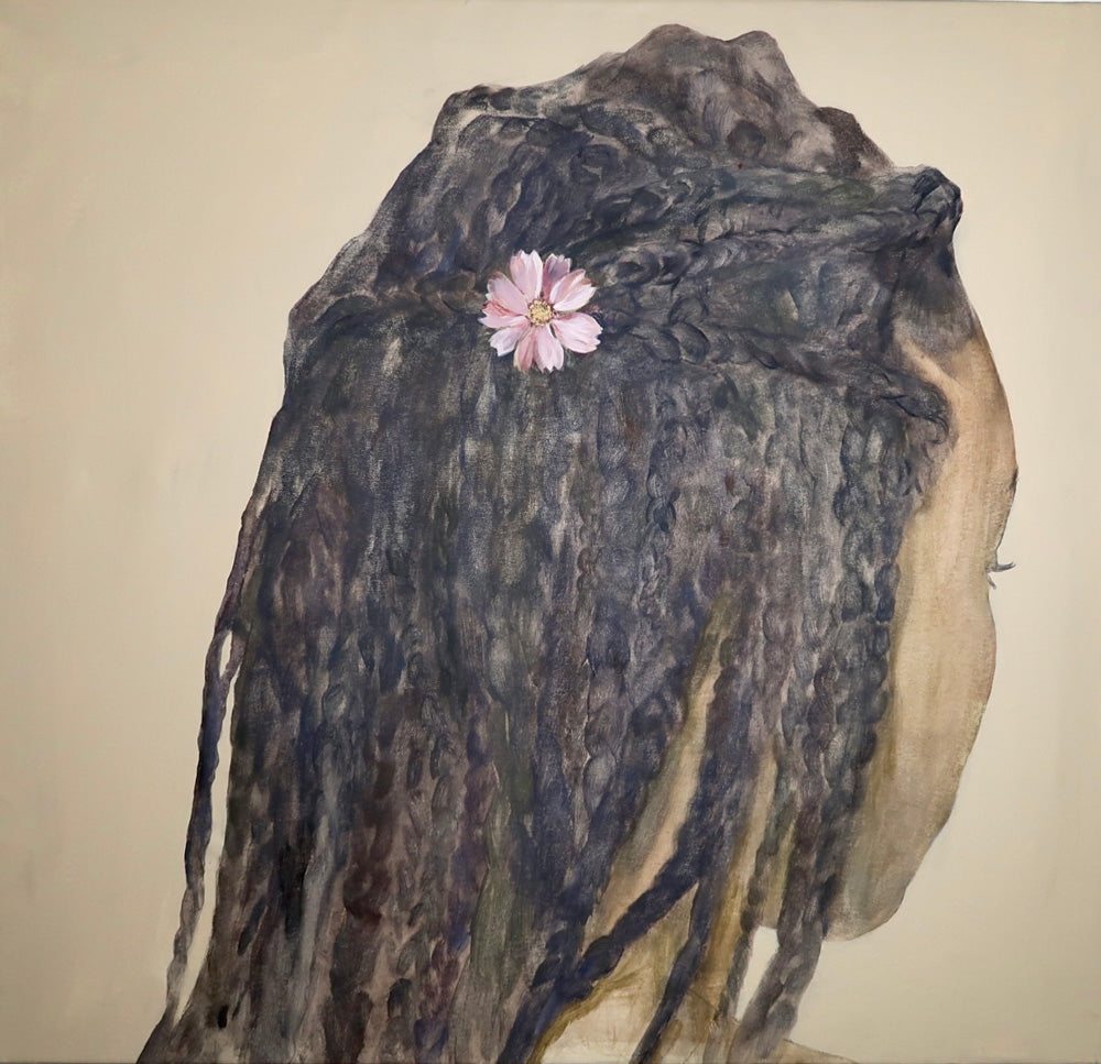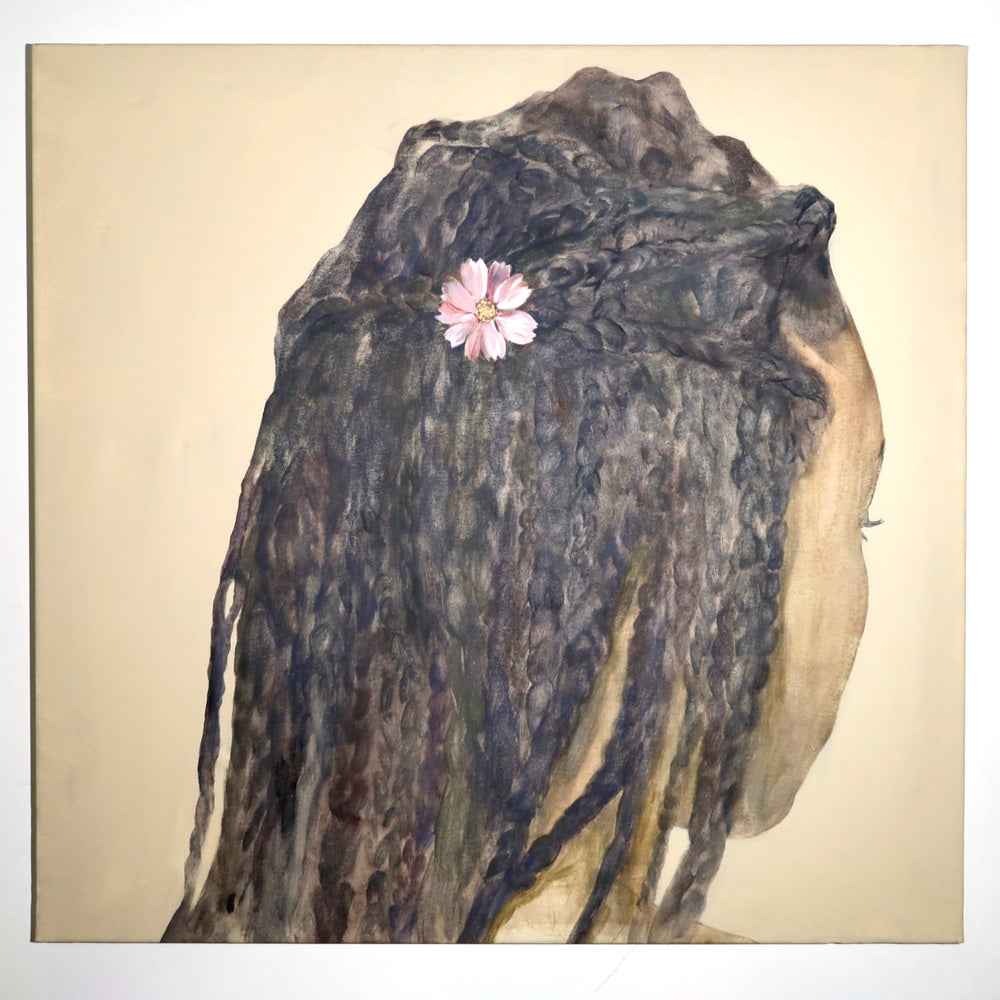 Jennifer Anoruie’s paintings focus on intimate, closely framed gestures: the back of a head, a braid adorned with a single flower, hands delicately holding a blade of grass. Rendered with a muted, earthy palette, her figures appear partially obscured or cropped, as though remembered in fragments. This partiality—never showing a full face—creates a sense of interiority, suggesting memory experienced from the inside rather than observed from afar. Her use of small, symbolic botanicals becomes a quiet language of belonging, tenderness, and cultural continuity. In her work, identity is not declared outright but revealed slowly through gesture, touch, and the everyday rituals that persist even in unfamiliar places. These images give shape to an unwritten heritage, honouring the subtle ways we carry our past with us.