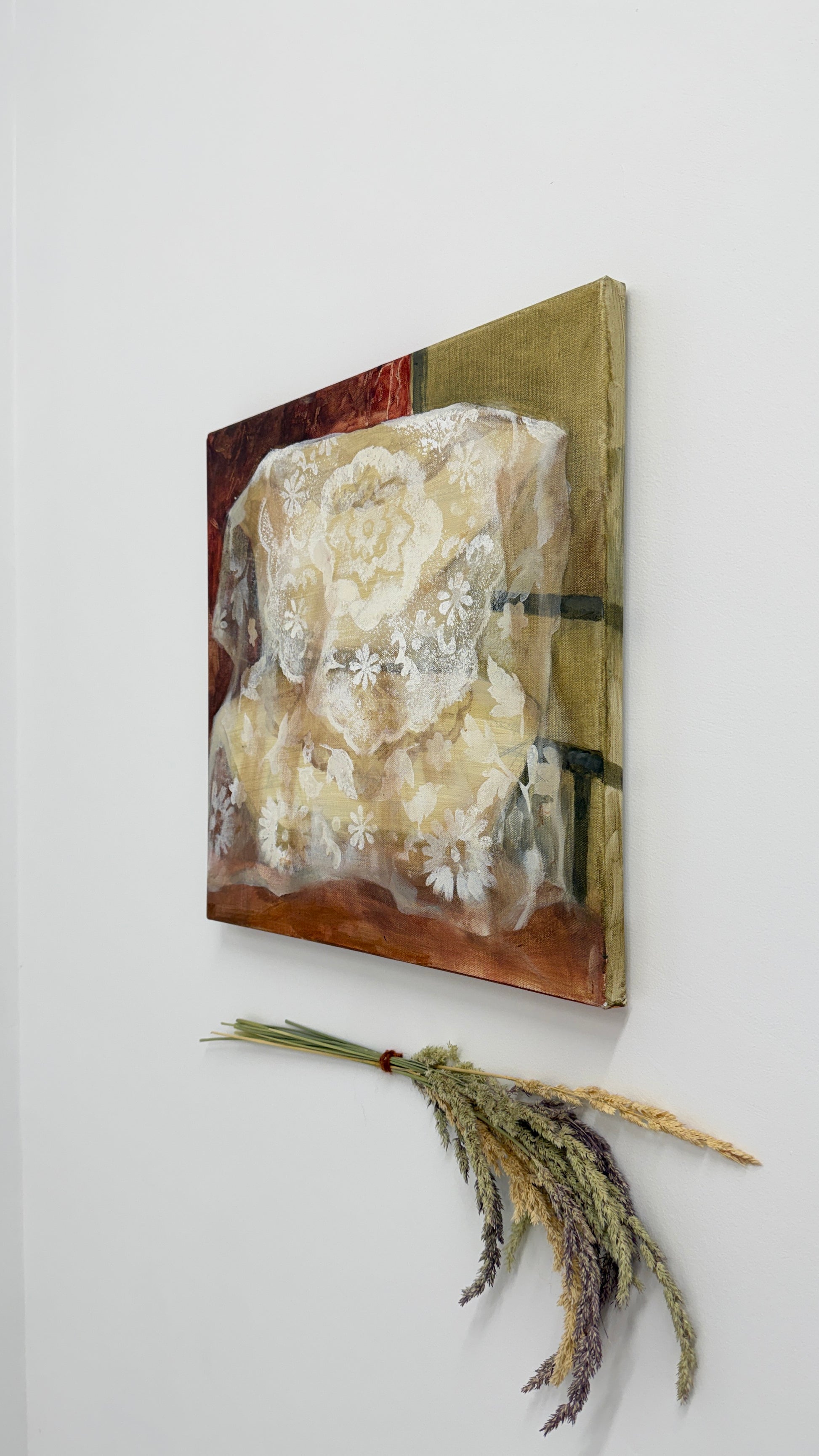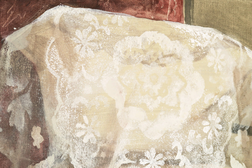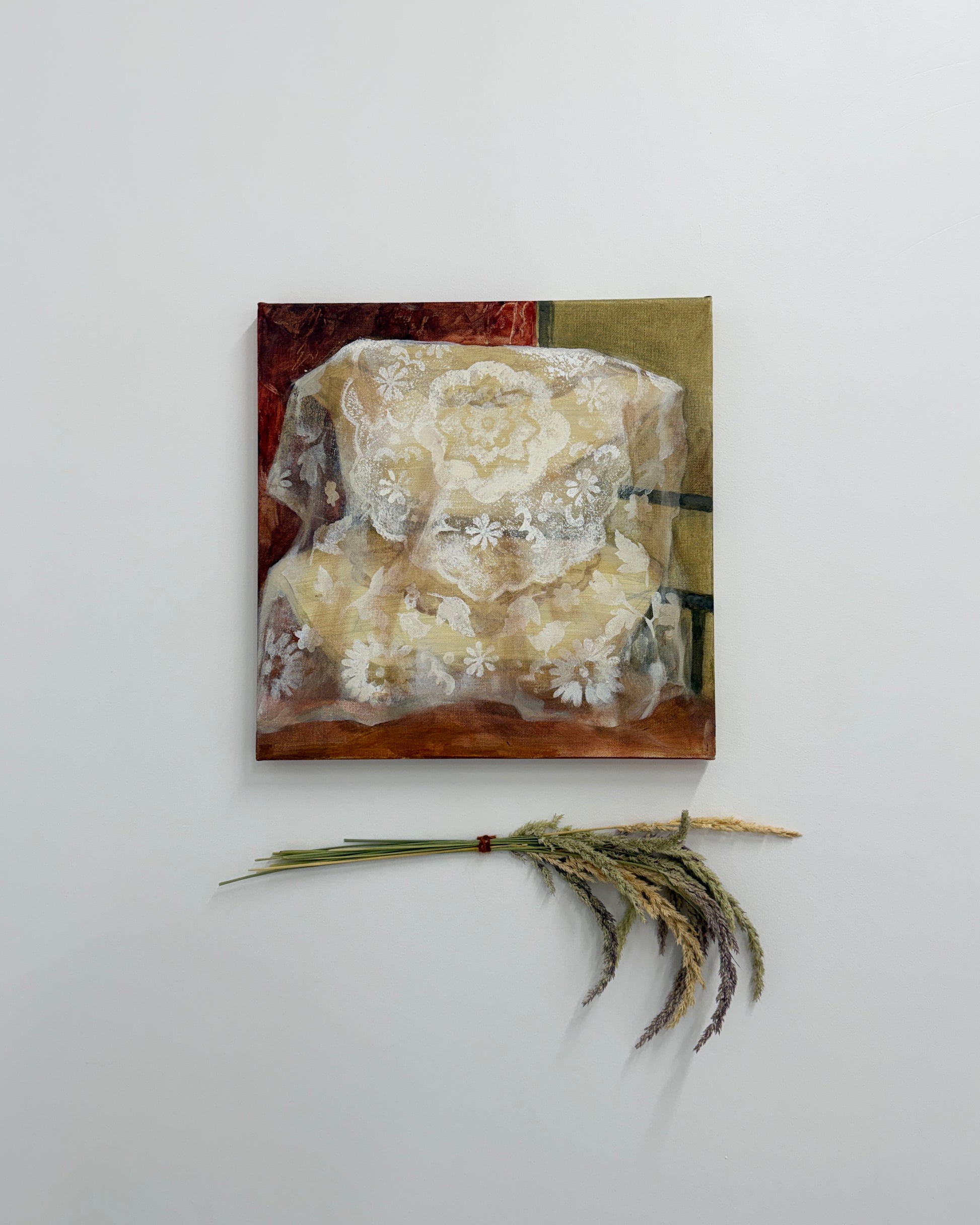 Jennifer Anoruie’s paintings focus on intimate, closely framed gestures: the back of a head, a braid adorned with a single flower, hands delicately holding a blade of grass. Rendered with a muted, earthy palette, her figures appear partially obscured or cropped, as though remembered in fragments. This partiality—never showing a full face—creates a sense of interiority, suggesting memory experienced from the inside rather than observed from afar. Her use of small, symbolic botanicals becomes a quiet language of belonging, tenderness, and cultural continuity. In her work, identity is not declared outright but revealed slowly through gesture, touch, and the everyday rituals that persist even in unfamiliar places. These images give shape to an unwritten heritage, honouring the subtle ways we carry our past with us.