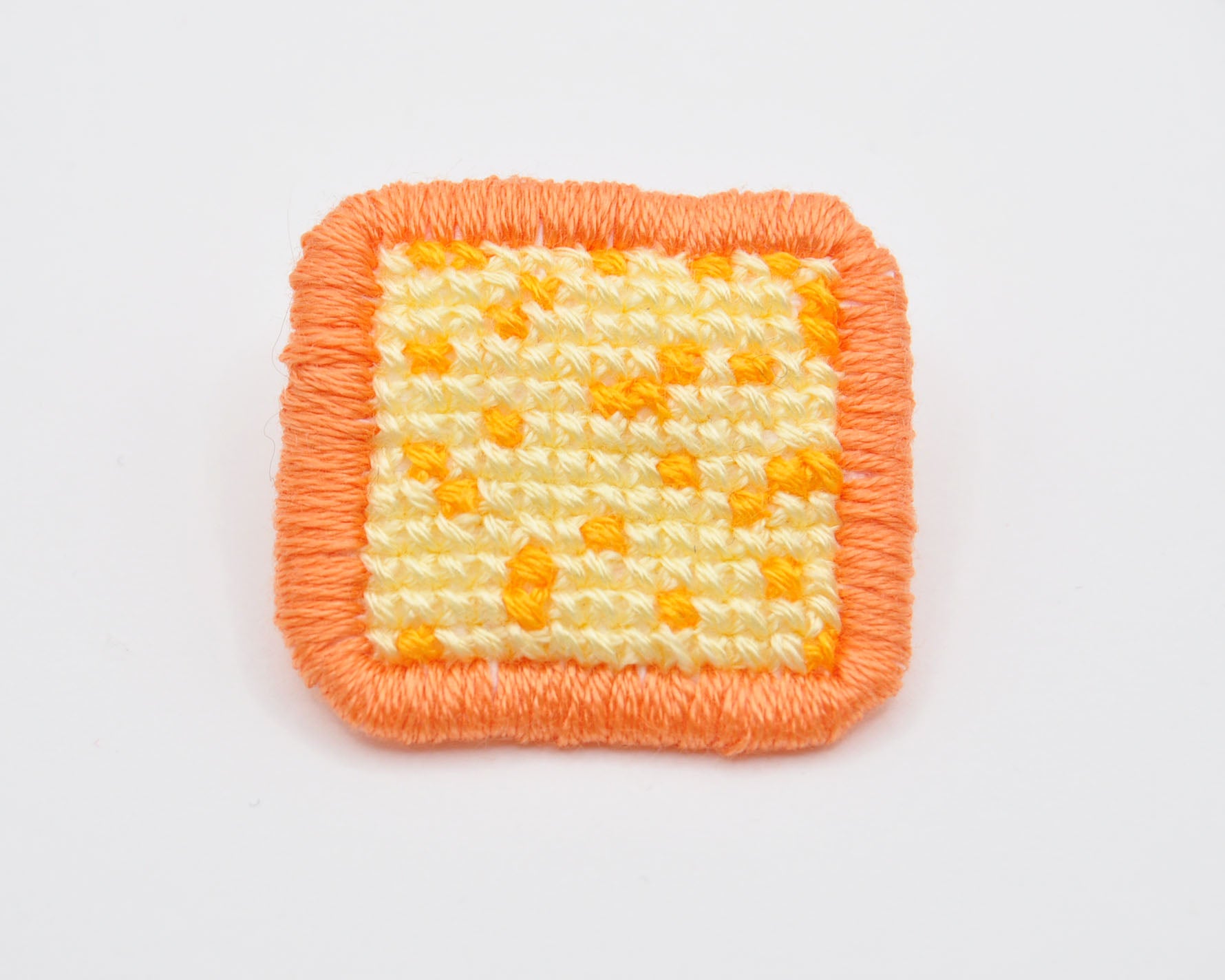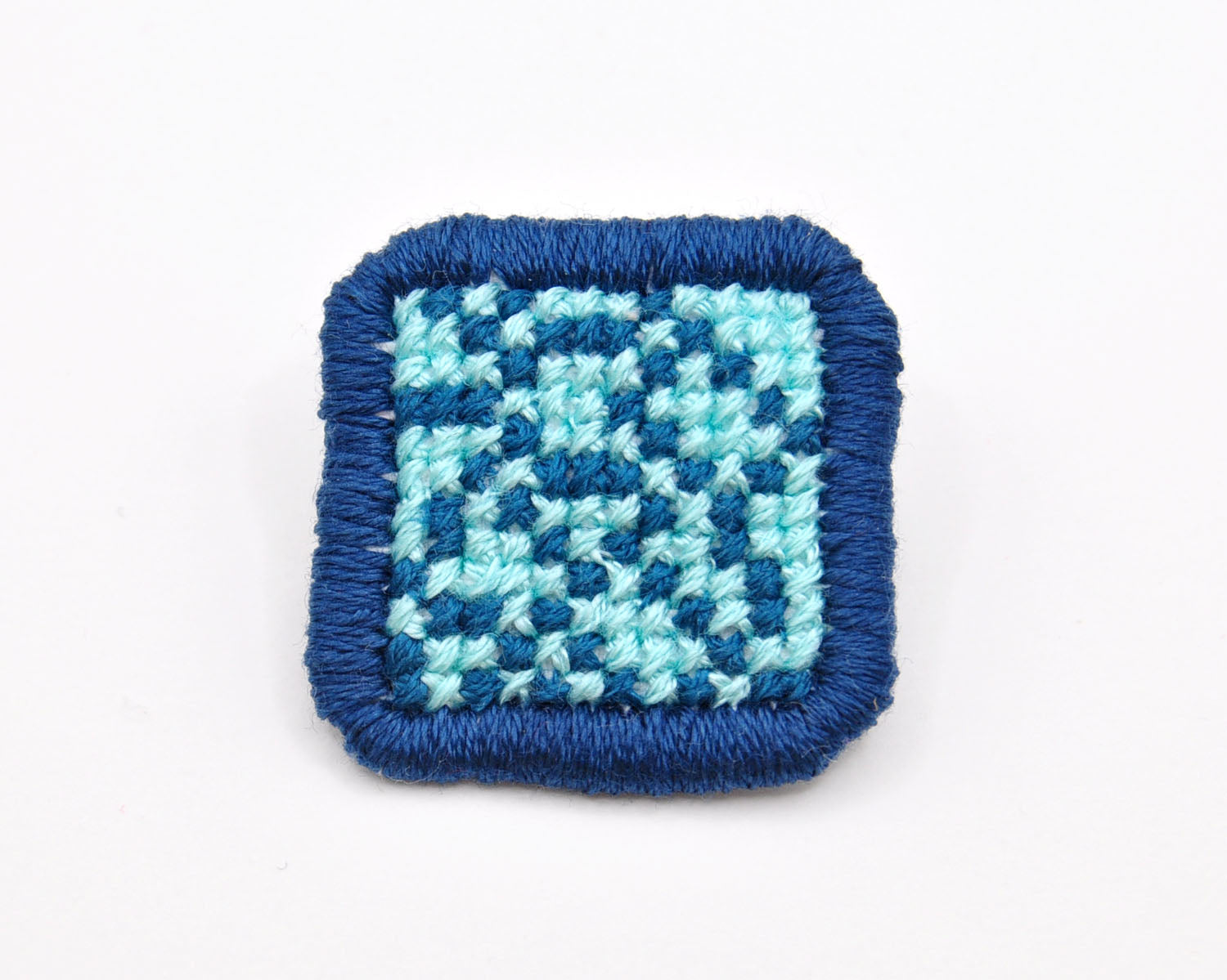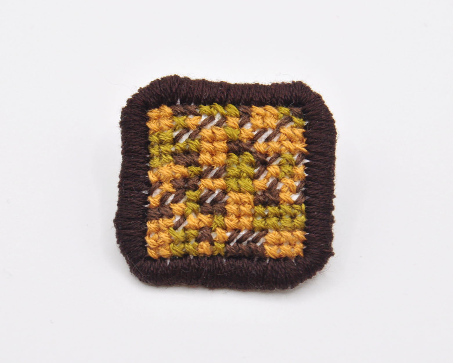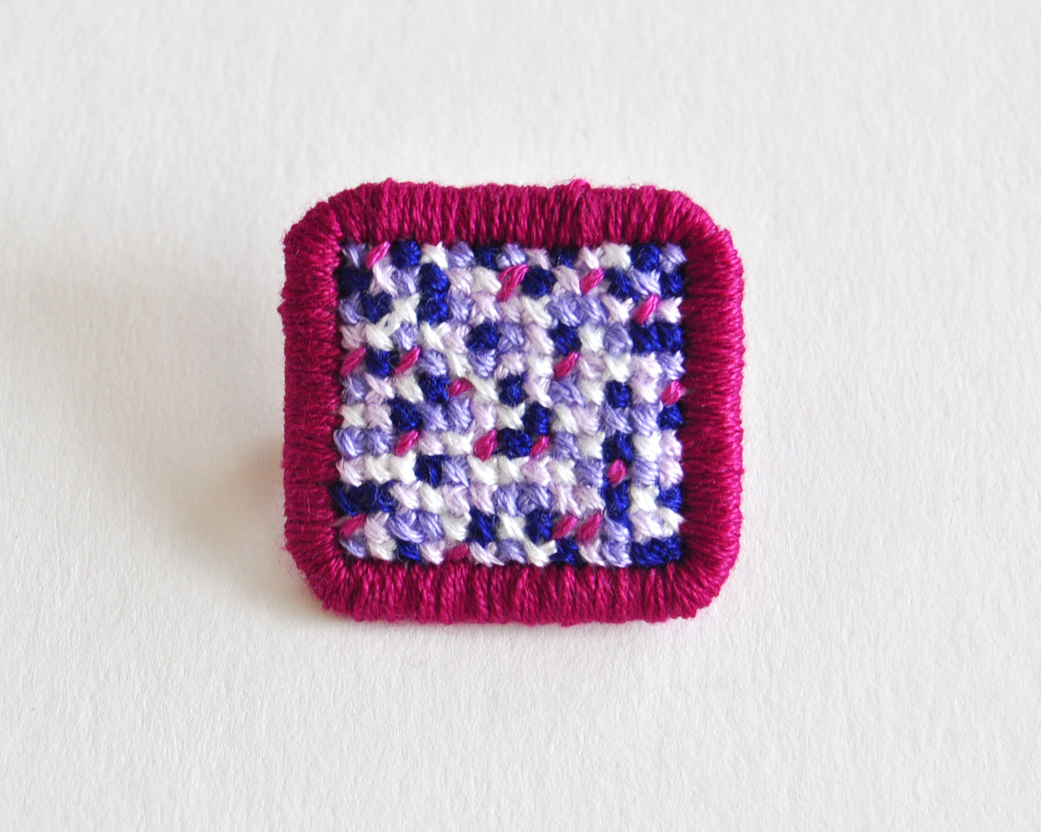 All cross-stitch pins are hand-stitched, one of a kind, and designed locally by Mallory Donen in her art studio at the City Centre Artist Lodge, Vancouver, BC.