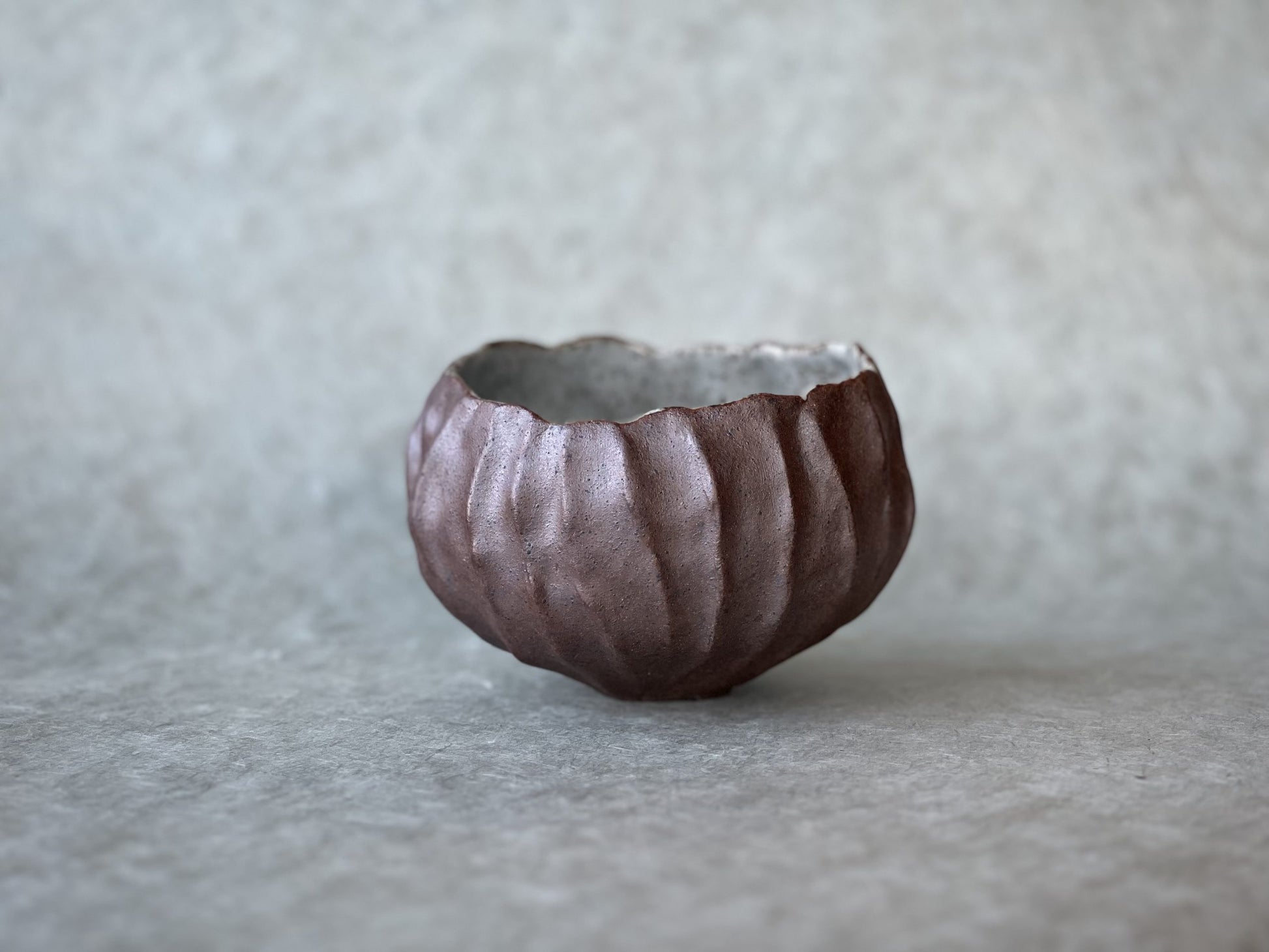 A sculptural vessel inspired by seed pods and delicate papery flower petals. Hand pinched and reduction-fired in a gas kiln bringing out the iridescent sheen of the iron-rich stoneware. Display on its own or use a flower frog for ikebana arrangements.