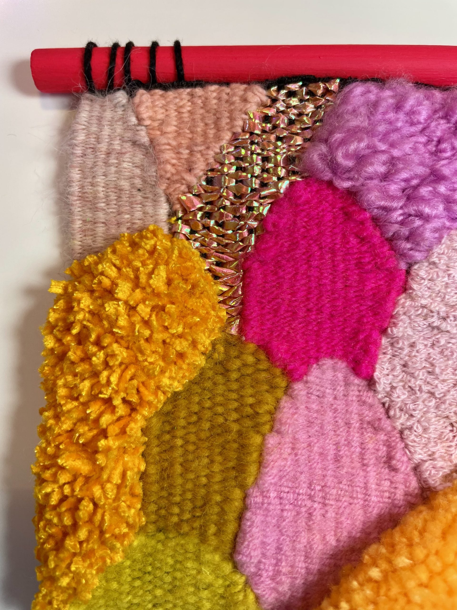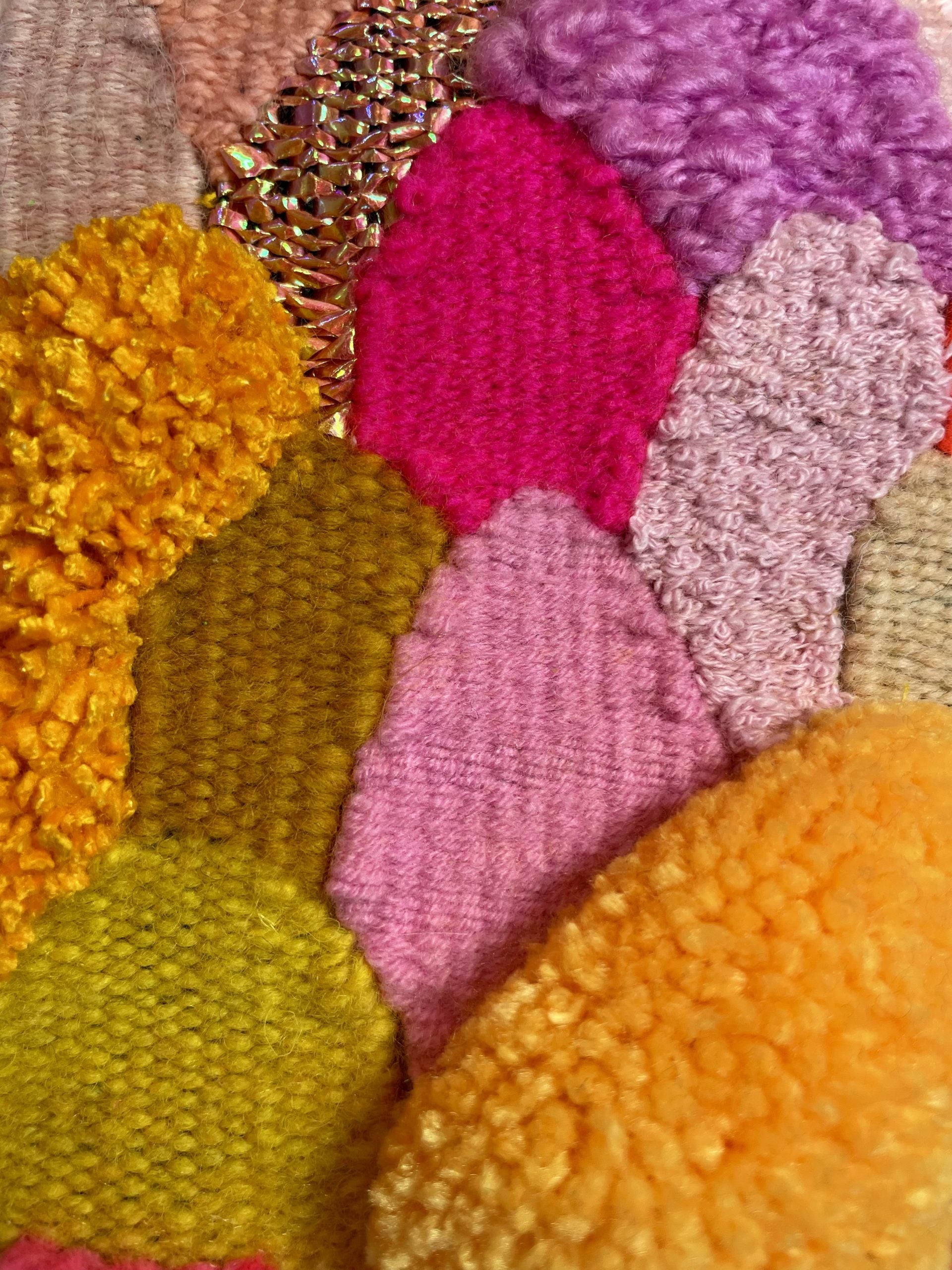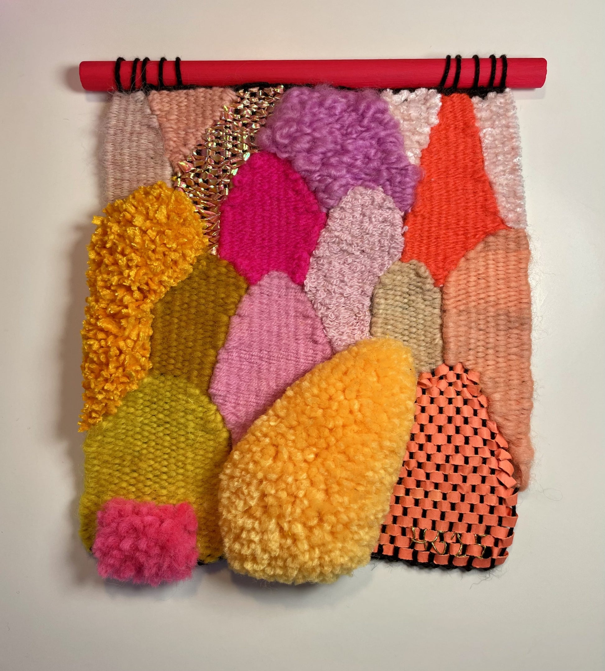 Repurposed, upcycled, and new elements, in natural and synthetic materials, such as wool, paper, ribbon, chenille, tinsel, cotton.