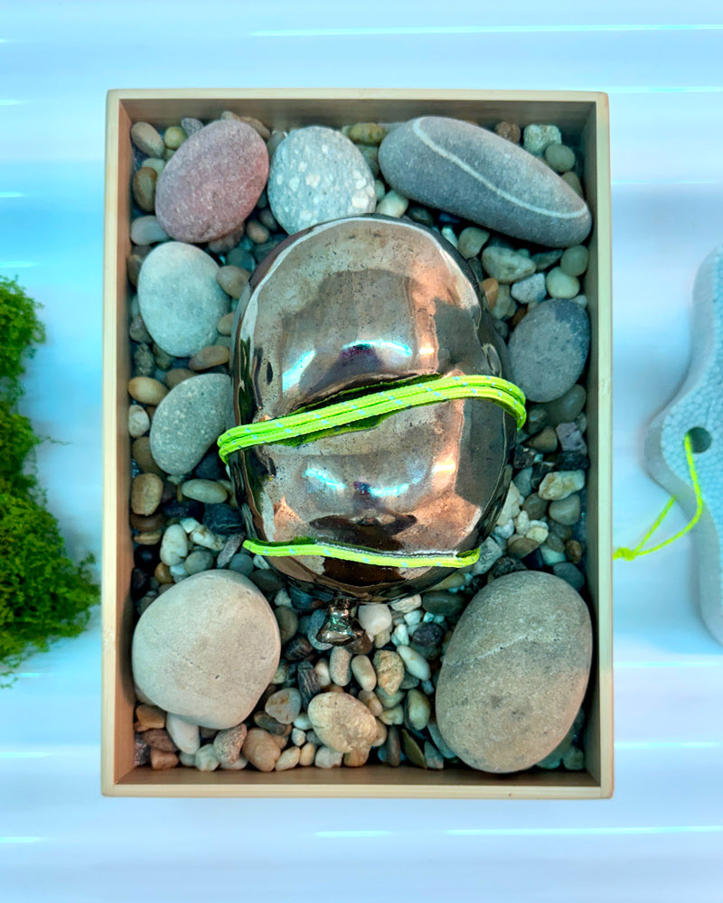 The neon element functions as a stabilizing band — part restraint, part support — suggesting an imposed equilibrium rather than a natural state.