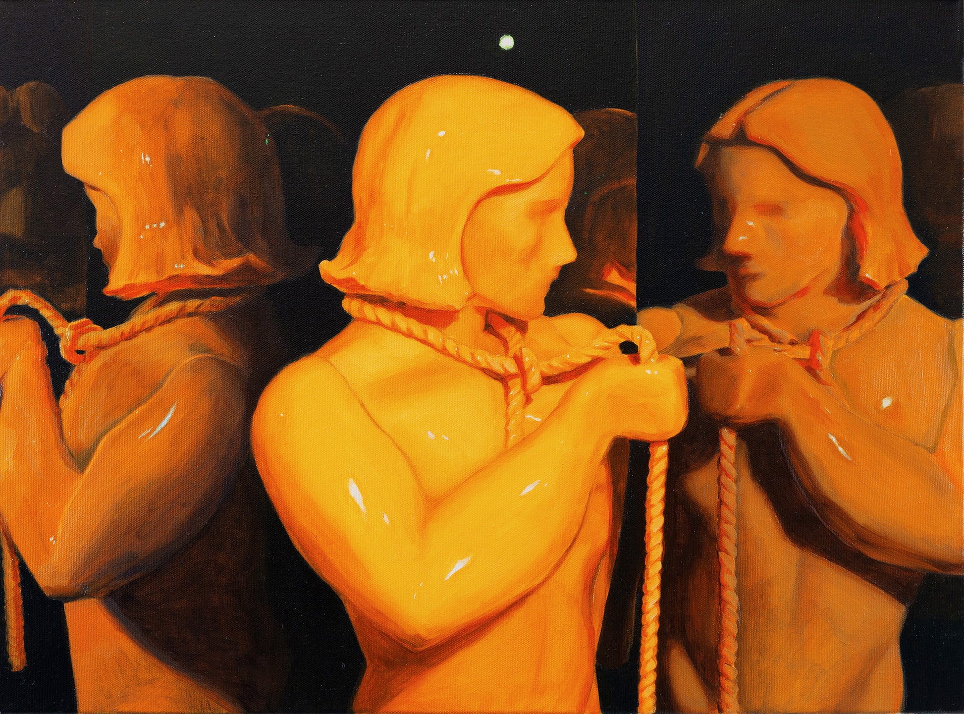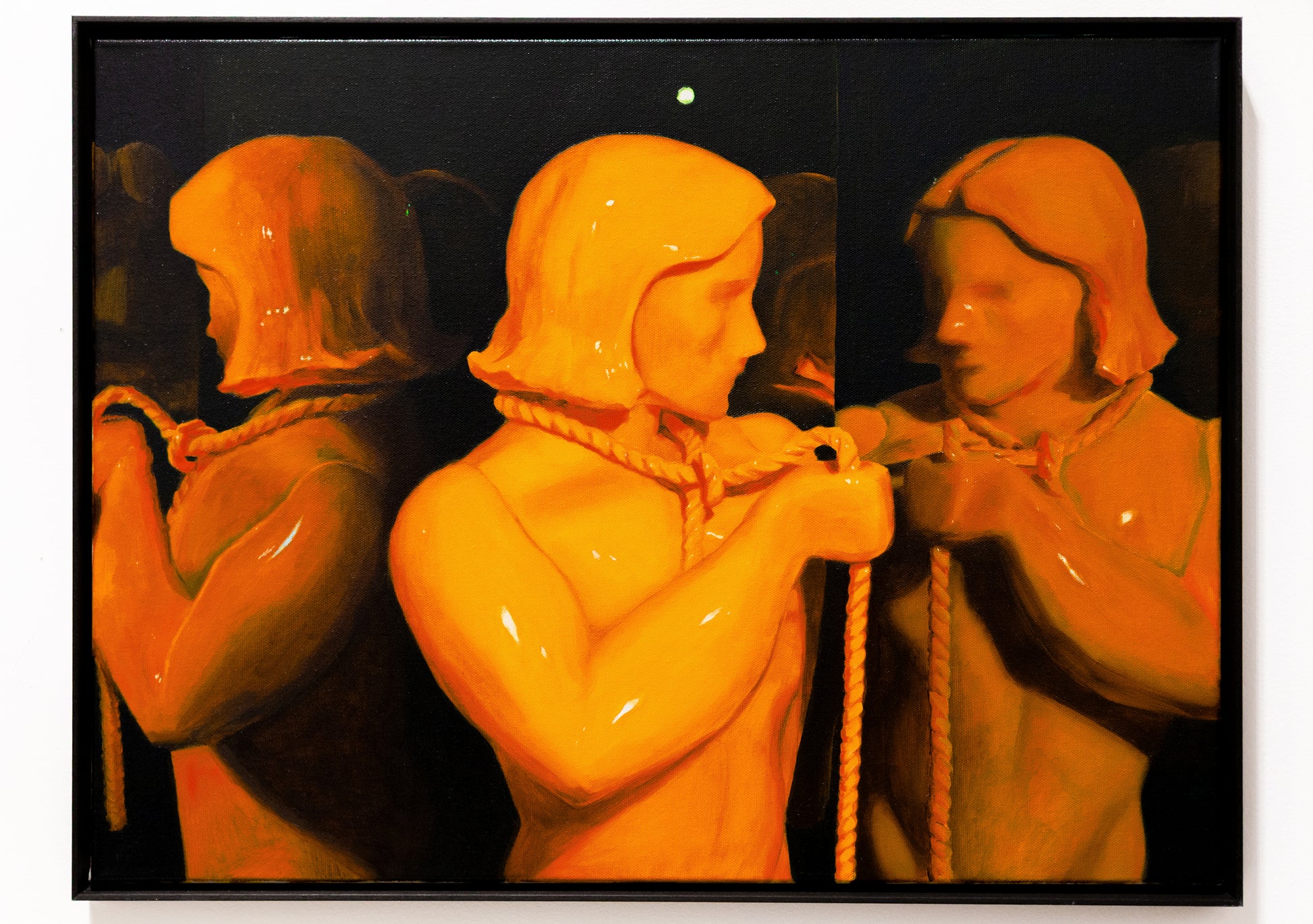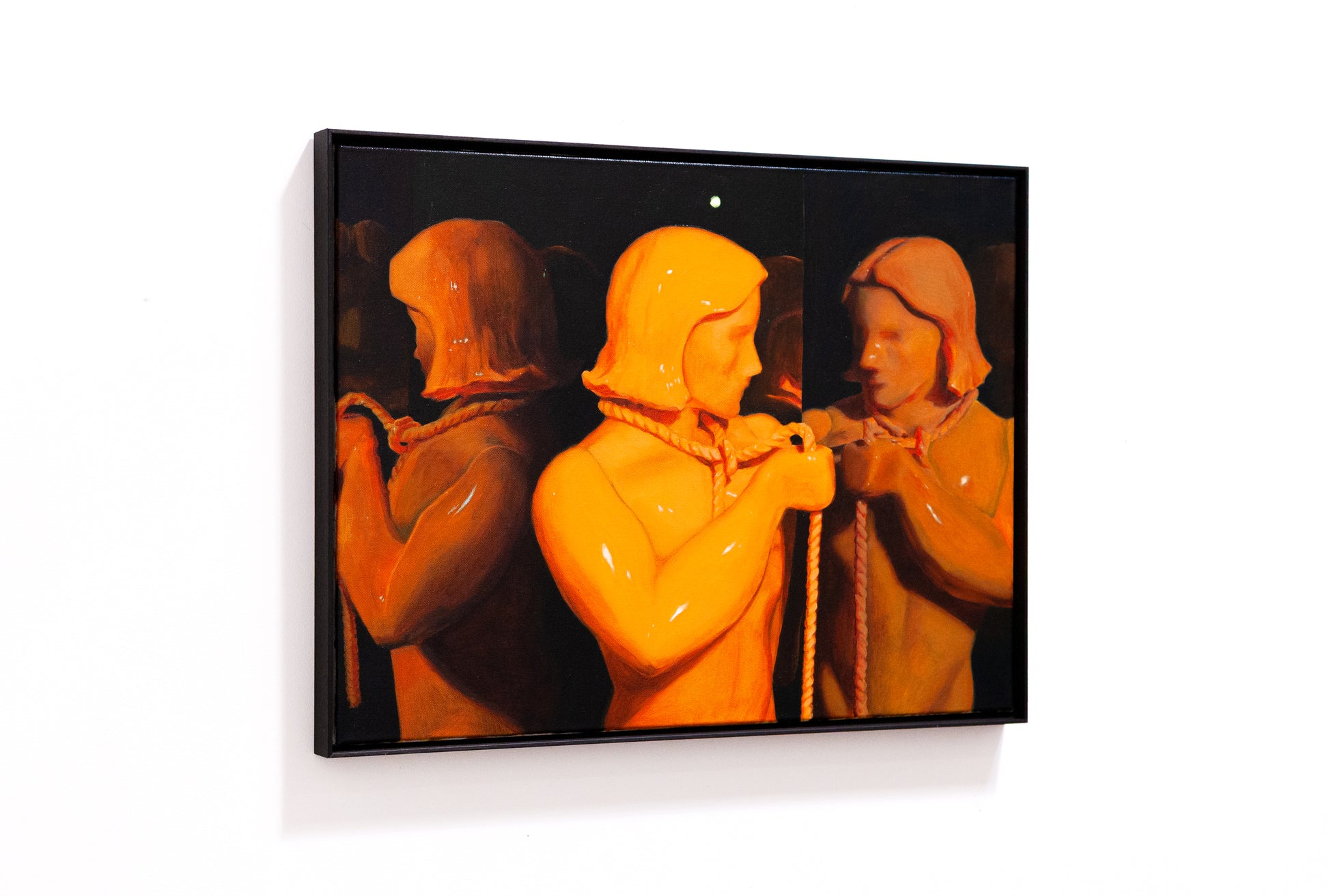 The Dupes depicts a modern Narcissus, contemplating his culpability amidst a dark wreath of reflections. An uncanny trio—part action figure, part digital effigy, part homoerotic pin-up—is anchored by a central figure offering a rope to himself, one end knotted around his neck, in a plea for submission. His reverse image betrays the depth of the ruse; the rope ends just out of frame and he is alone. A rumination on masculinity in crisis, this work empathetically casts contemporary manhood as a mirror maze of disconnection, competition, and power, imagining self-compassion as more vital to recuperation than self-blame.