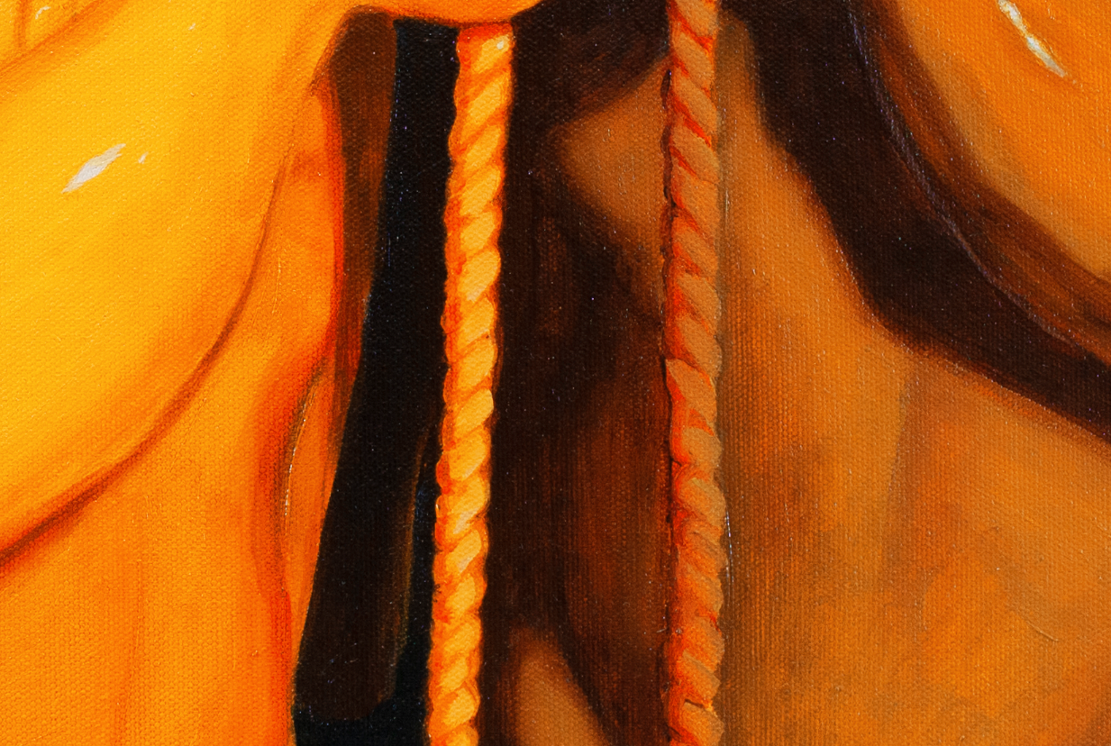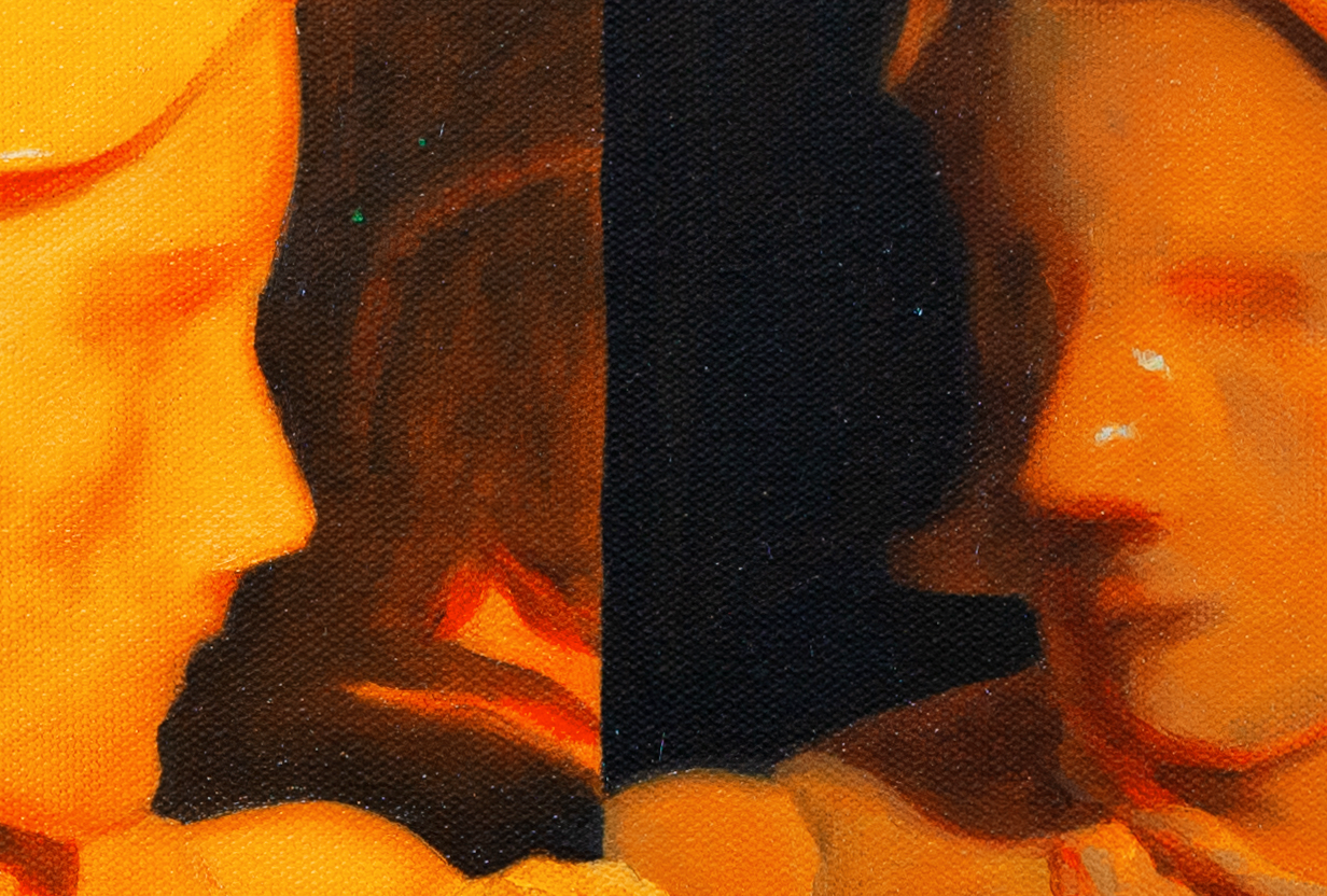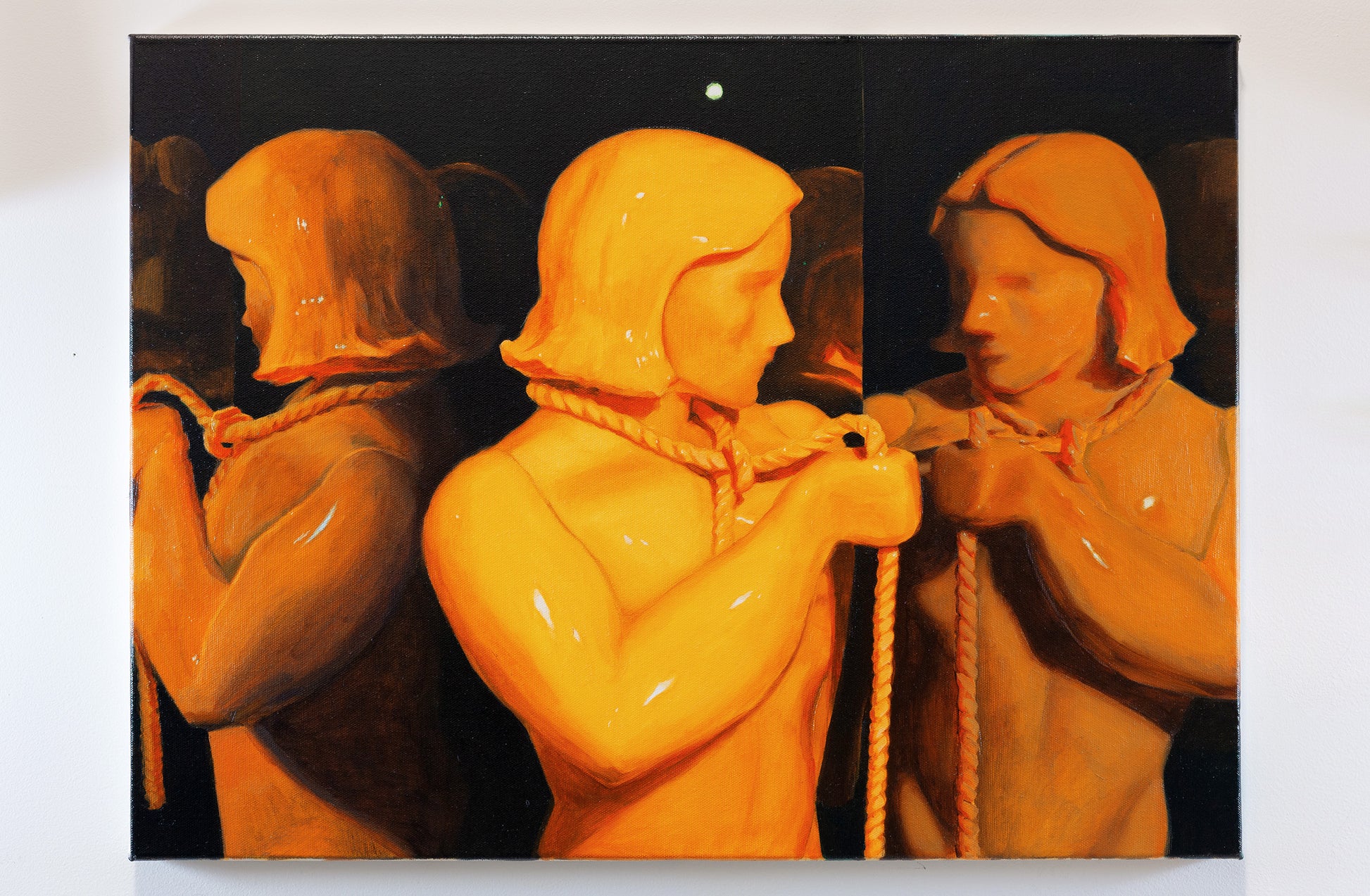 The Dupes depicts a modern Narcissus, contemplating his culpability amidst a dark wreath of reflections. An uncanny trio—part action figure, part digital effigy, part homoerotic pin-up—is anchored by a central figure offering a rope to himself, one end knotted around his neck, in a plea for submission. His reverse image betrays the depth of the ruse; the rope ends just out of frame and he is alone. A rumination on masculinity in crisis, this work empathetically casts contemporary manhood as a mirror maze of disconnection, competition, and power, imagining self-compassion as more vital to recuperation than self-blame.
