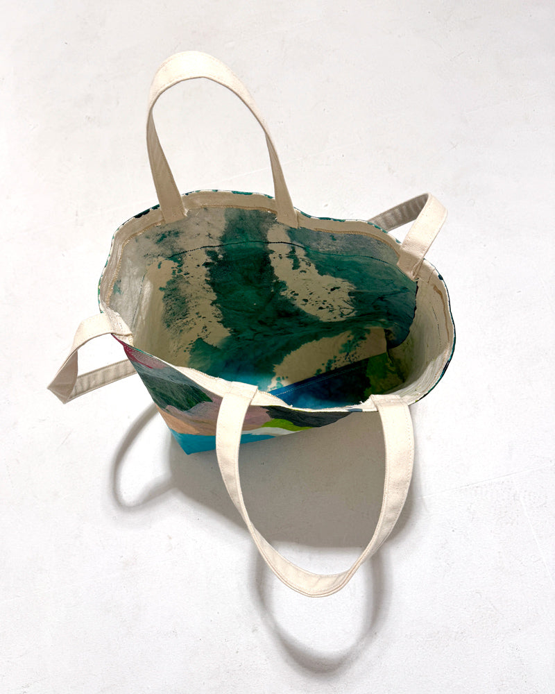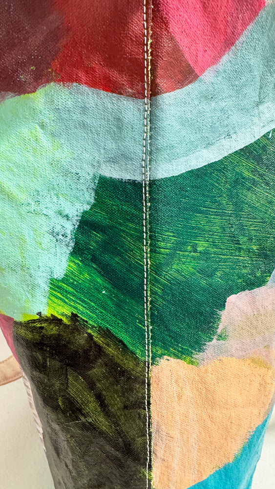 The BANNER Totes are more than just a functional accessory—they are tangible expressions of the artist's labour. Crafted from a reclaimed painted banner that was commissioned to hang in a Vancouver restaurant, each piece carries the marks, stains, and textures that come from hours of dedicated creative work.